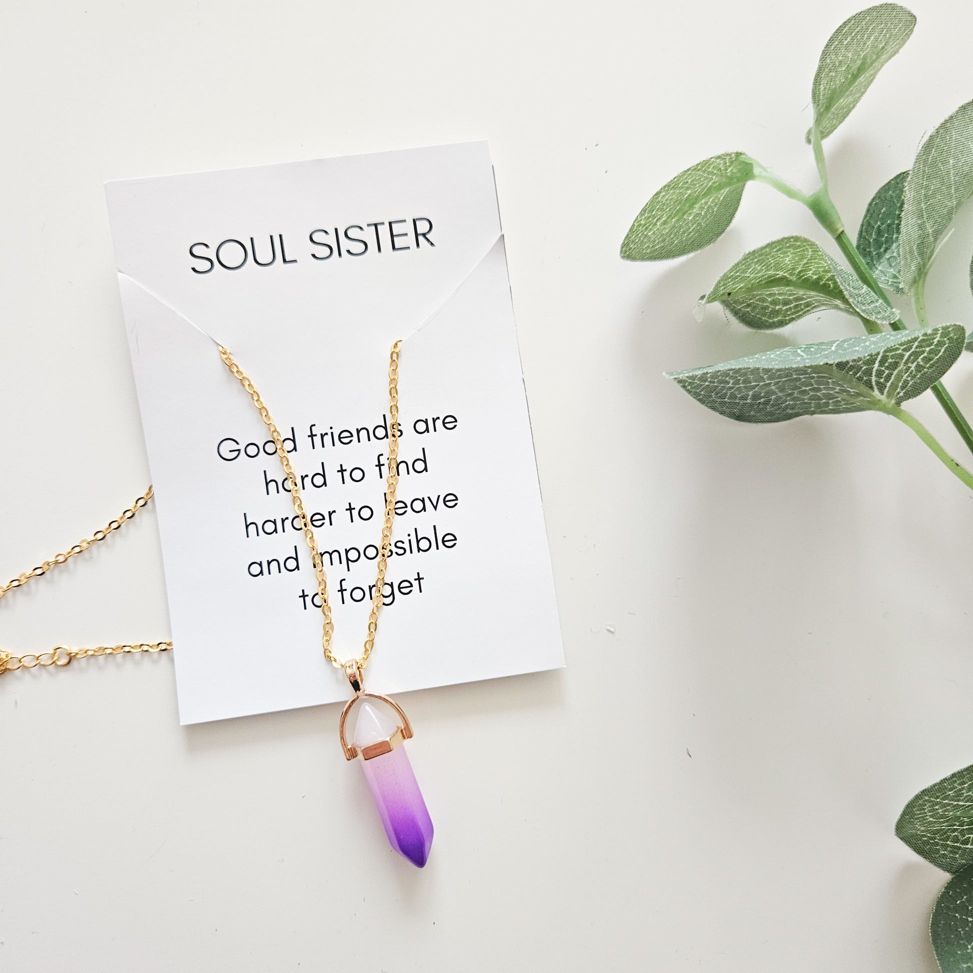 Celebrate the unbreakable bond of friendship with this elegant Soul Sister Necklace, featuring a stunning crystal pendant on a delicate gold chain. A thoughtful keepsake to remind her how special she is.